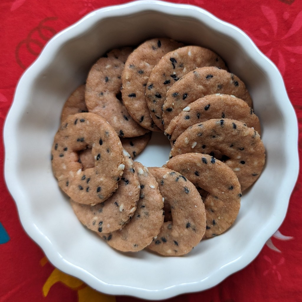Sweet and savory sesame thins, made with sesame seeds, winter melon and garlic, this biscuit sits in between savory and sweet. It is oddly addicting due to the presence of Chinese red miso. It also is known as “little chicken biscuit” in Chinese.